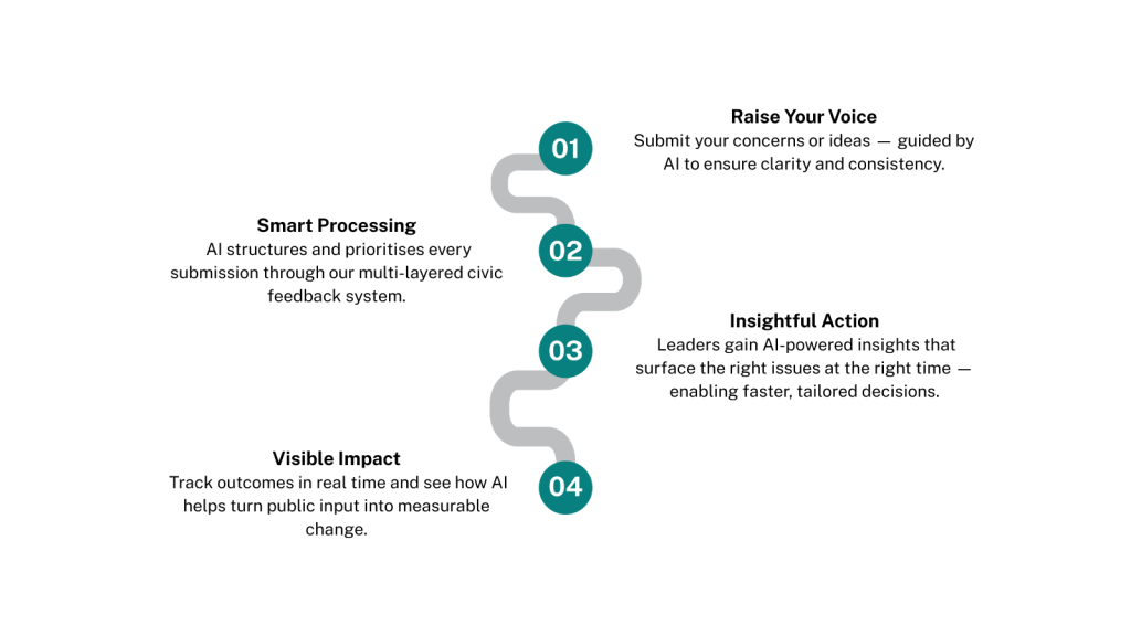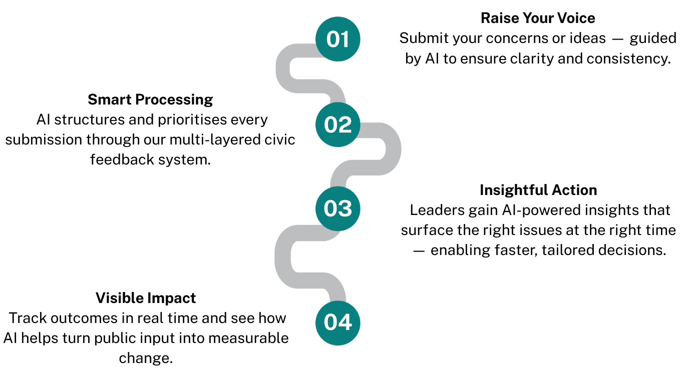 Our system transforms feedback into insights for both local and national decision-makers — helping drive smarter responses from councils to Parliament.